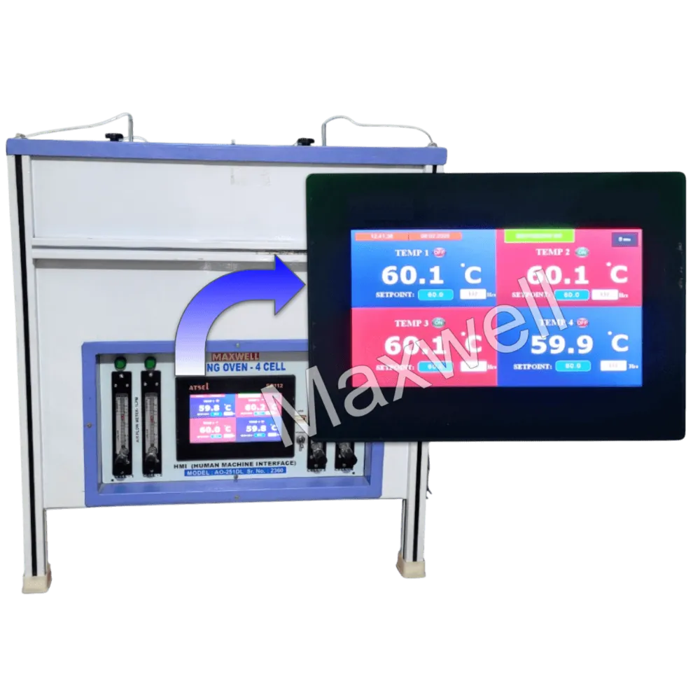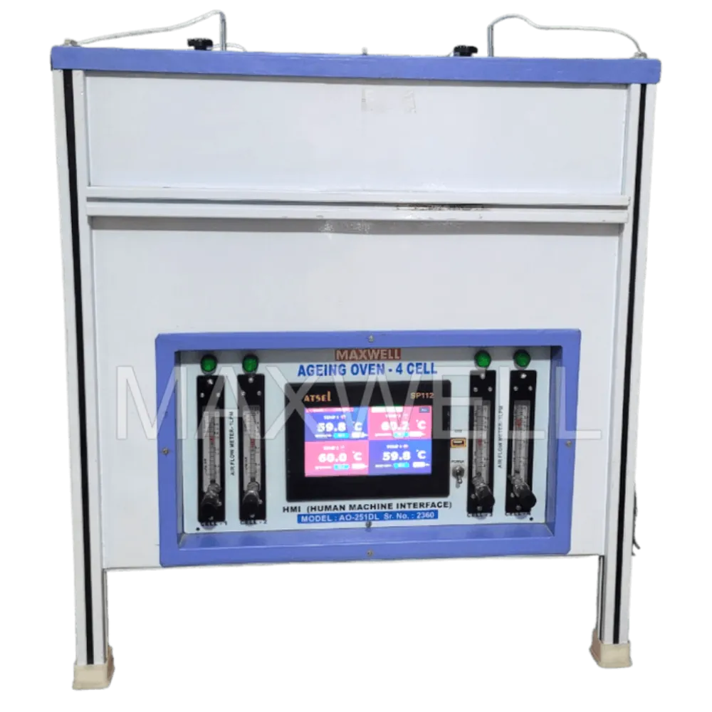 Each of the four ageing cells operates independently, featuring its own PID controller, digital temperature indicator, airflow meter, and hour meter. This ensures complete control, precise monitoring, and uniform heating across all cells with ±0.2°C accuracy.