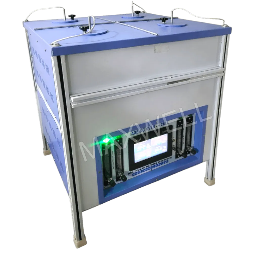 The Ageing Oven 4 Cell AO-251DL (HMI) is a high-precision thermal ageing system designed for accurate and consistent evaluation of cables, polymers, and insulating materials. Developed in line with ISO 188 Method A, IEC 60811-501, IEC 60811-1-2, IEC 60216-4-3, IS 10810 Part 10 & 11, BIS: 694 (2010) standards, this model ensures stable temperature control and reliable performance during extended ageing cycles, including continuous 7-day testing.