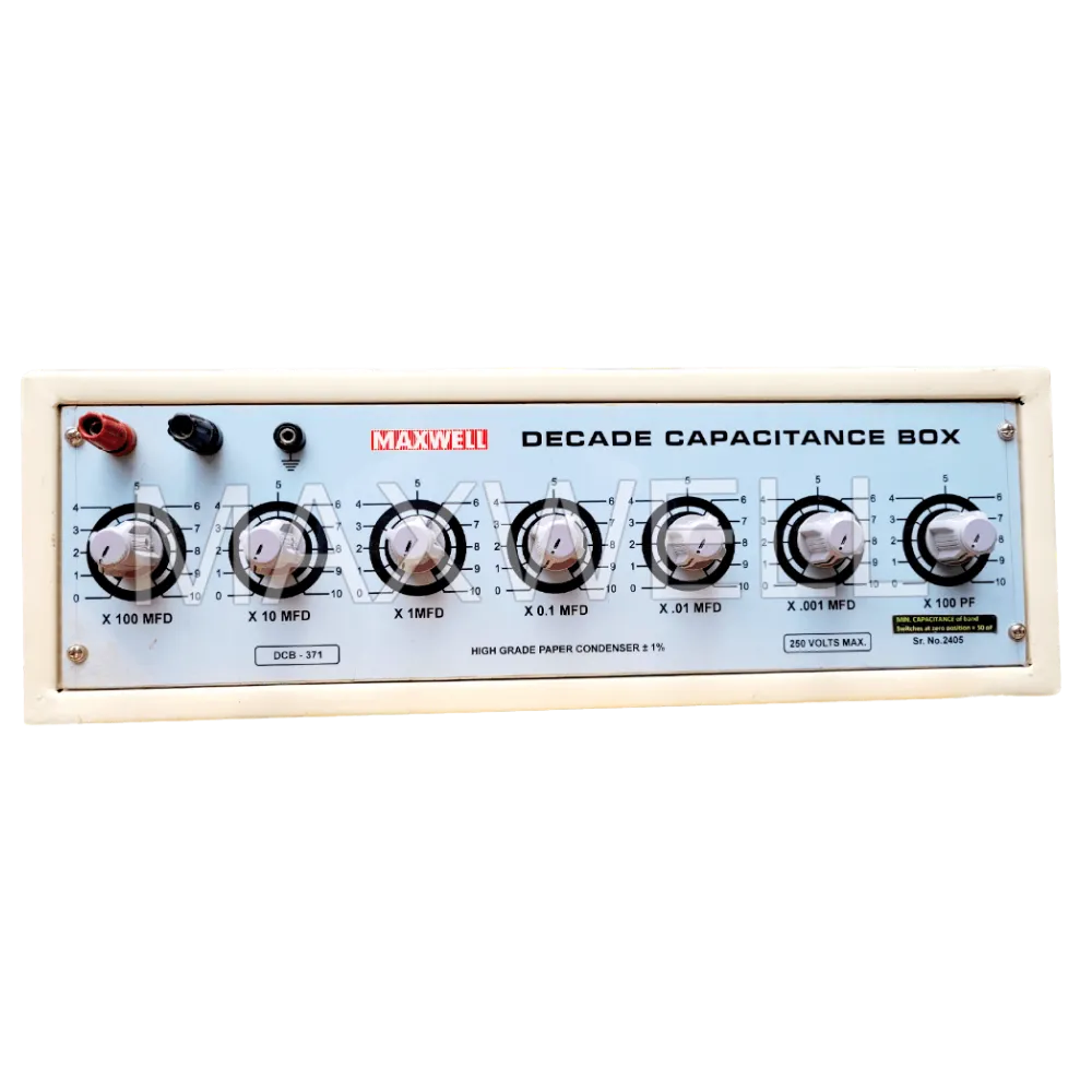 The Decade Capacitance Box DCB-371 is a high-precision standard instrument designed for accurate selection and simulation of capacitance values in laboratories, calibration setups, and testing environments. With seven rotary dials, it allows quick and reliable setting of capacitance from as low as 100 pF up to 1111.111 µF.