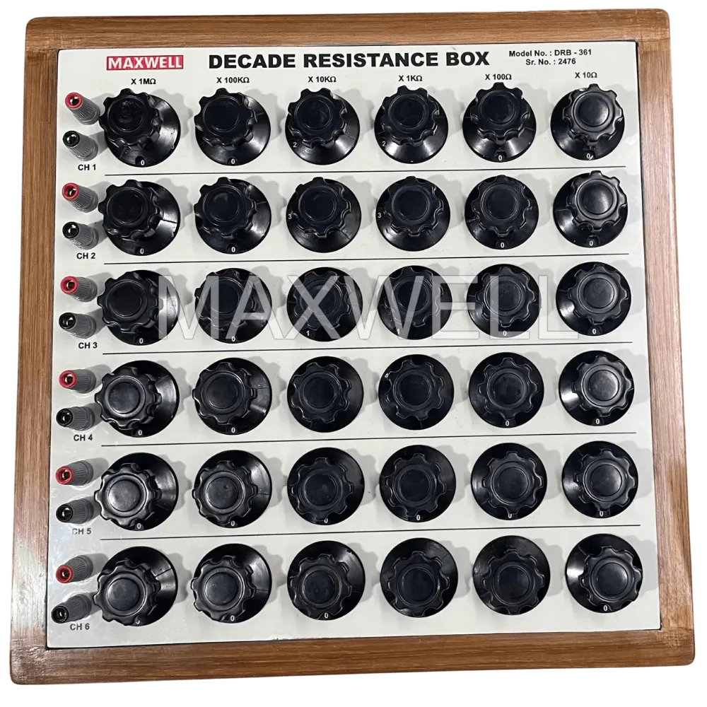 The Decade Resistance Box DRB-361 is a precision-engineered instrument designed for accurate resistance selection and calibration in laboratory and industrial environments. With 6 decades of adjustable resistance values—ranging from 1 ohm to 1.1111 megohms—this decade box ensures smooth, stable, and repeatable measurements for a wide range of electrical testing applications.