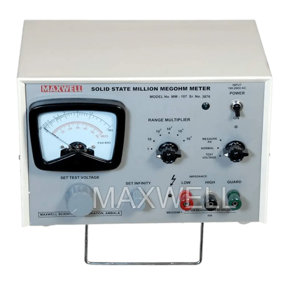 The Million Megohm Meter MM-107 is a highly specialized instrument engineered for insulation resistance (IR) testing in applications that require measurement of extremely high resistance values, reaching up to 10 Tera-ohms. This makes it ideal for testing high-voltage components, dielectric materials, transformer insulation, cable insulation quality, and industrial electrical systems.