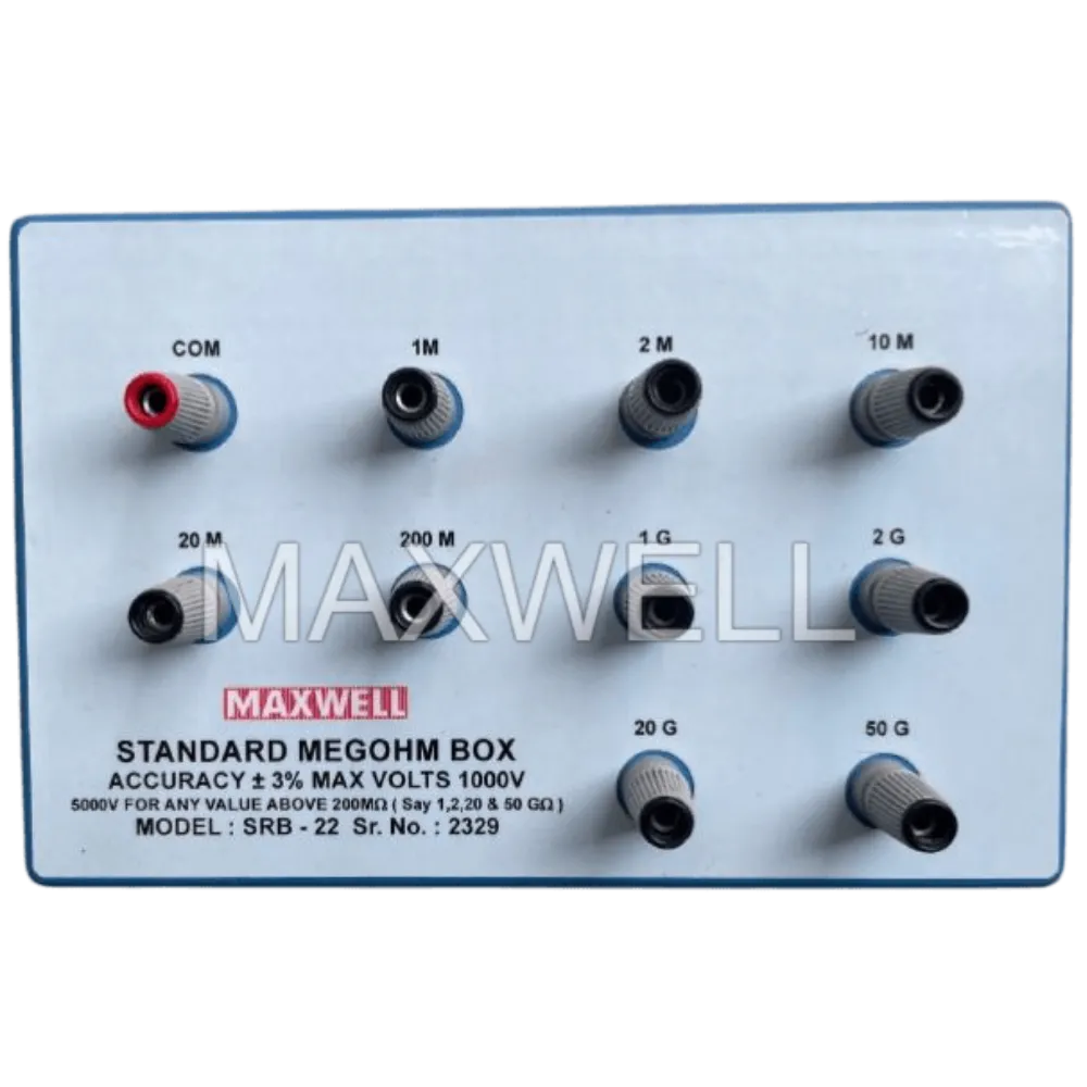 Standard Meg-Ohm Box SRB-22 with 9 fixed resistance values from 1MΩ to 50GΩ. Ideal reference standard for insulation testers. Supports up to 5000V with ±3% accuracy, ensuring reliable calibration for electrical and laboratory applications.