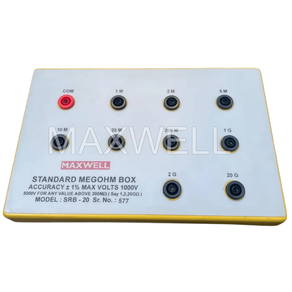 The Standard Meg-Ohm Box SRB-20 is a high-accuracy reference resistance box engineered for precise calibration of insulation testers and high-resistance measurement equipment. Featuring nine fixed resistance values from 1MΩ to 20GΩ, it is ideal for applications requiring reliable and traceable insulation resistance standards.