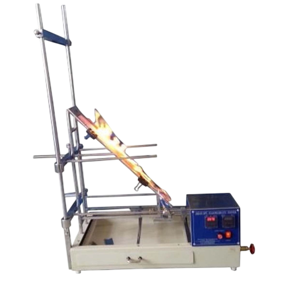 The machine features a stainless steel test chamber designed to minimize air disturbance, ensuring accurate and repeatable test results. It supports vertical and 45° specimen orientations, allowing compliance with multiple testing clauses of IS 9873 Part-2.